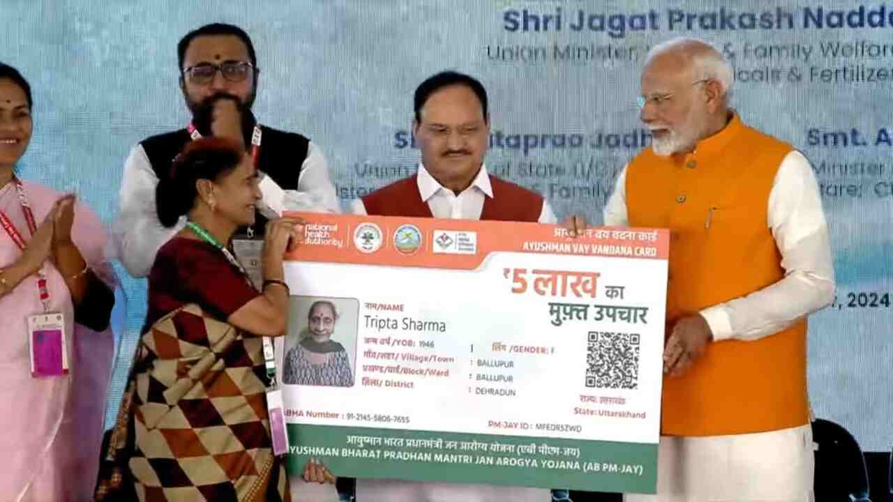 भारत सरकार ने आयुष्मान योजना को विस्तार देते हुए देश के 70 साल से अधिक उम्र के सभी वरिष्ठ नागरिकों को सालाना 5 लाख तक निशुल्क इलाज की सुविधा दिए जाने को लेकर आयुष्मान वय वंदना कार्ड को शुरू किया है. जिसके जरिए सभी वरिष्ठ नागरिकों को अस्पताल में निःशुल्क उपचार मिलेगा. ऐसे में दिल्ली में आयोजित कार्यक्रम के दौरान देहरादून की रहने वाली तृप्ता शर्मा को प्रधानमंत्री नरेंद्र मोदी ने आयुष्मान वय वंदना कार्ड देकर सम्मानित किया.