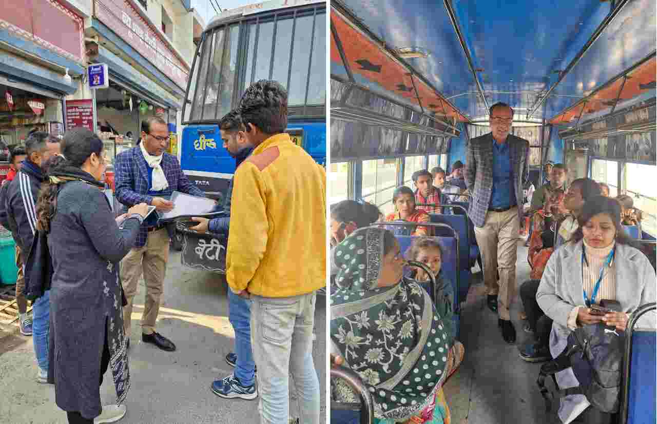 उस दौरान राजपुर-क्लेमेनटाउन मार्ग की राजपुर की तरफ से आ रही सिटी बस में आरटीओ सामान्य यात्री बनकर सवार हो गए। बस में सभी सीटें फुल थीं और कुछ यात्री खड़े हुए थे। सिटी बस के चालक और परिचालक यूनिफार्म में भी नहीं थे। इस दौरान आरटीओ ने पूरी बस का निरीक्षण किया और यात्रियों से सामान्य पूछताछ की। निरीक्षण के दौरान आरटीओ को महिला आरक्षित सीटों पर पुरुष यात्री बैठे हुए मिले।