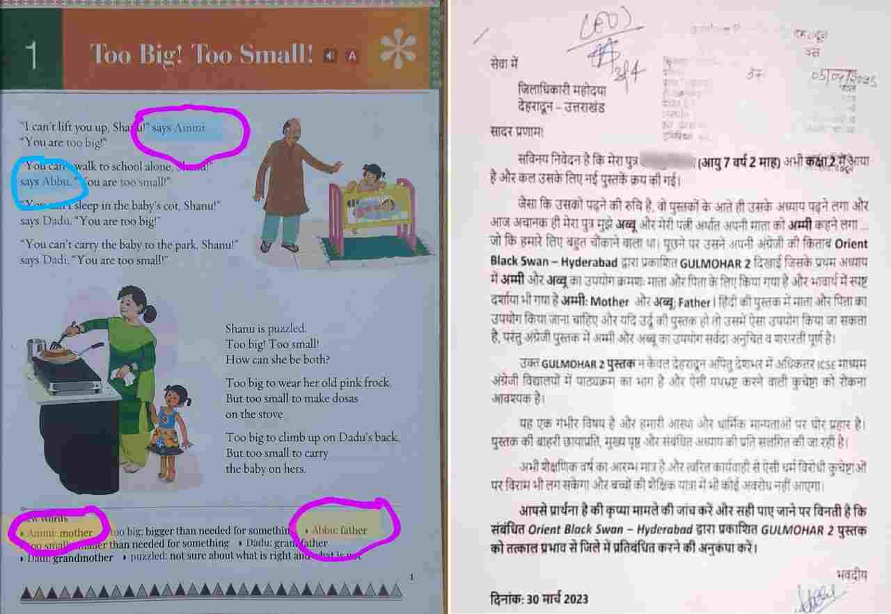 दरअसल, देहरादून के मनीष मित्तल नाम के एक व्यक्ति ने जिलाधिकारी सोनिका सिंह को लिखित शिकायत देकर कहा है कि उनका बेटा कक्षा दो में पढ़ता है, वो अचानक उन्हें अब्बू और अपनी मम्मी को अम्मी कहने लगा है. शिकायत में कहा गया है कि छात्र की कक्षा दो की गुलमोहर 2 नाम की अंग्रेजी की किताब में एक अध्याय में मम्मी पापा को अब्बू अम्मी लिखा गया है और इसे पढ़कर अब उनका बेटा भी बोलचाल में बदलाव कर रहा है.