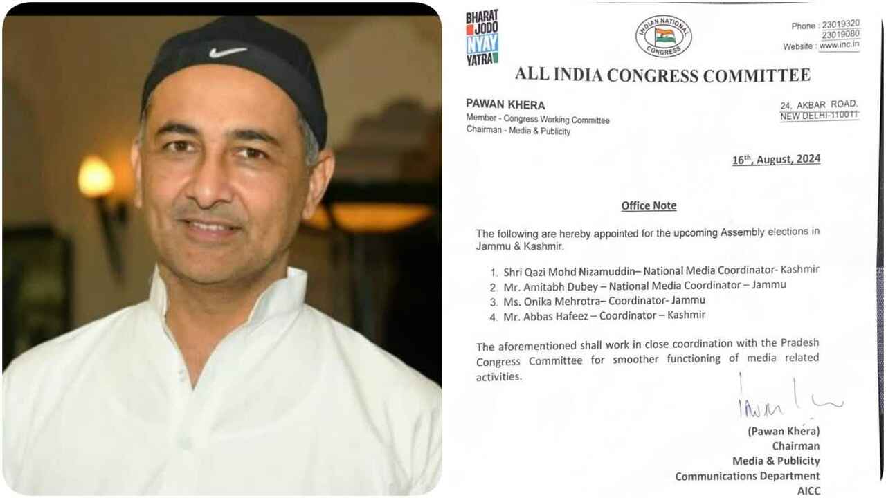 कांग्रेस वर्किंग कमेटी के मीडिया और पब्लिसिटी के अध्यक्ष पवन खेड़ा की ओर से जारी पत्र में जम्मू कश्मीर में होने जा रहे असेंबली चुनाव को देखते हुए चार नेताओं को अहम जिम्मेदारी सौंपी गईं है. इसमें मंगलौर विधानसभा सीट से विधायक काजी निजामुद्दीन को कश्मीर का राष्ट्रीय मीडिया कोआर्डिनेटर बनाया गया है. अमिताभ दुबे को जम्मू के लिए राष्ट्रीय मीडिया कॉर्डिनेटर और ओनिका मेहरोत्रा को जम्मू का समन्वयक, इसके साथ ही अब्बास हाफिज को कश्मीर चुनाव में कोऑर्डिनेटर की नियुक्ति की है.