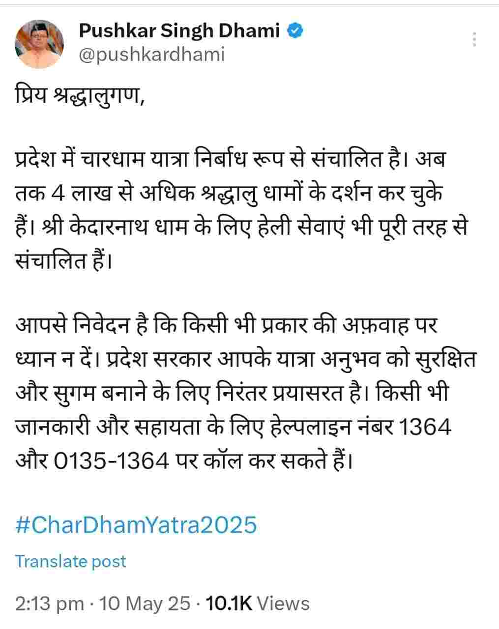 उन्होंने आगे लोगों से अपील करते हुए कहा, “आपसे निवेदन है कि किसी भी प्रकार की अफवाह पर ध्यान न दें. प्रदेश सरकार आपके यात्रा अनुभव को सुरक्षित और सुगम बनाने के लिए निरंतर प्रयासरत है. किसी भी जानकारी और सहायता के लिए हेल्पलाइन नंबर 1364 और 0135-1364 पर कॉल कर सकते हैं.” इससे पहले सीएम पुष्कर धामी ने सोशल मीडिया प्लेटफॉर्म एक्स पर लिखा, ”देवभूमि उत्तराखंड में प्रत्येक वर्ष बड़ी संख्या में श्रद्धालुगण चारधाम यात्रा हेतु पधारते हैं, हमारी सरकार द्वारा यात्रा को सुगम, सुरक्षित और सुव्यवस्थित बनाने हेतु निरंतर कार्य किए जा रहे हैं. यह बेहतर हो रही व्यवस्थाओं का ही परिणाम है कि मात्र 9 दिनों में 4 लाख से अधिक श्रद्धालु चारों धामों में दर्शन कर चुके हैं.”