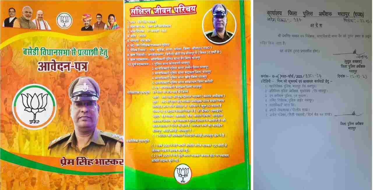 जानकारी के मुताबिक, बीजेपी से टिकट की मांग करने वाले प्रेम सिंह भास्कर धौलपुर जिले के रहने वाले हैं. वर्तमान में उनकी तैनाती भरतपुर जिले में थी. उन्होंने बीजेपी से टिकट की मांग करते हुए बसेड़ी विधानसभा सीट से चुनाव लड़ने का कथित आवेदन पत्र जारी किया था. इसके अलावा उन्होंने अपनी जीवन का परिचय भी इस पंपलेट में दिया. उन्होंने लिखा कि वे अब समाज सेवा करना चाहते हैं. लेकिन चुनाव लड़ने का खुमार के चलते उनको निलंबित कर दिया गया है. फिलहाल, ये घटना इलाके में चर्चा का विषय बनी हुई है.