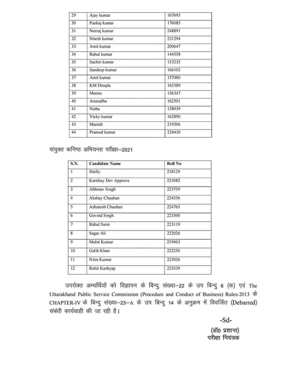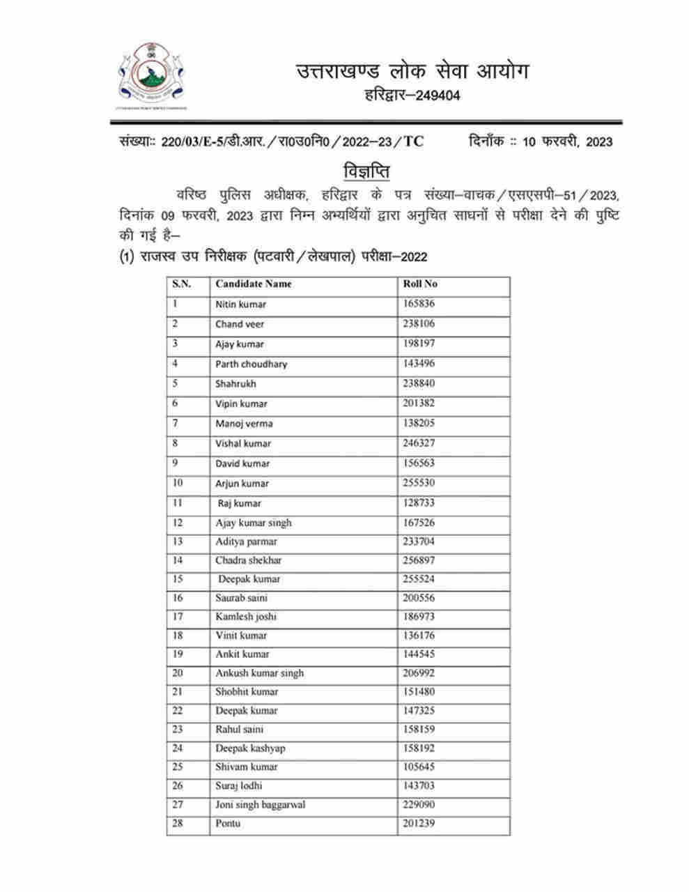 शनिवार को आयोग द्वारा ऐसे अभ्‍यर्थियों की सूची जारी की गई है। जिसमें कुल 56 नाम शामिल हैं। इनमें 44 नाम पटवारी लेखपाल परीक्षा 2022 में शामिल अभ्‍यर्थियों के हैं। बाकी 12 नाम संयुक्‍त कनिष्‍क अभियंता परीक्षा 2021 के अभ्‍यर्थियों के शामिल हैं।