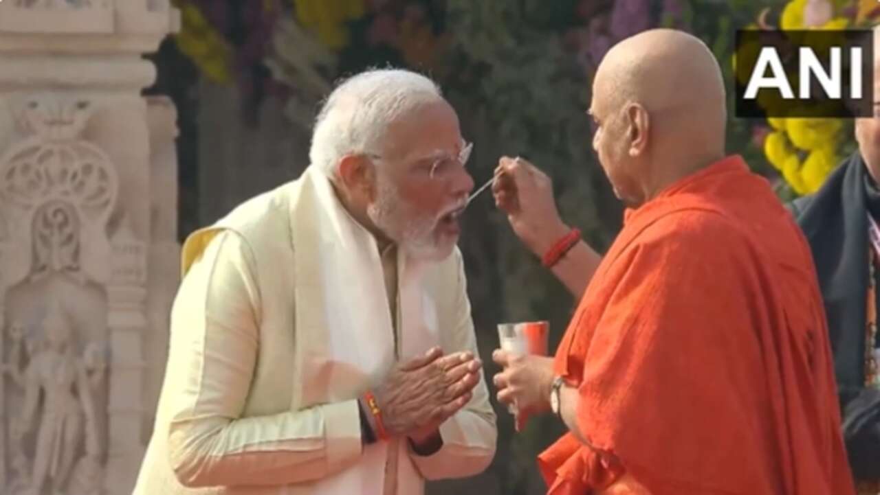 #WATCH | PM Narendra Modi breaks his fast after the ‘Pran Pratishtha’ ceremony at the Shri Ram Janmaboomi Temple in Ayodhya. #RamMandirPranPrathistha pic.twitter.com/Zng1IHJ2FJ