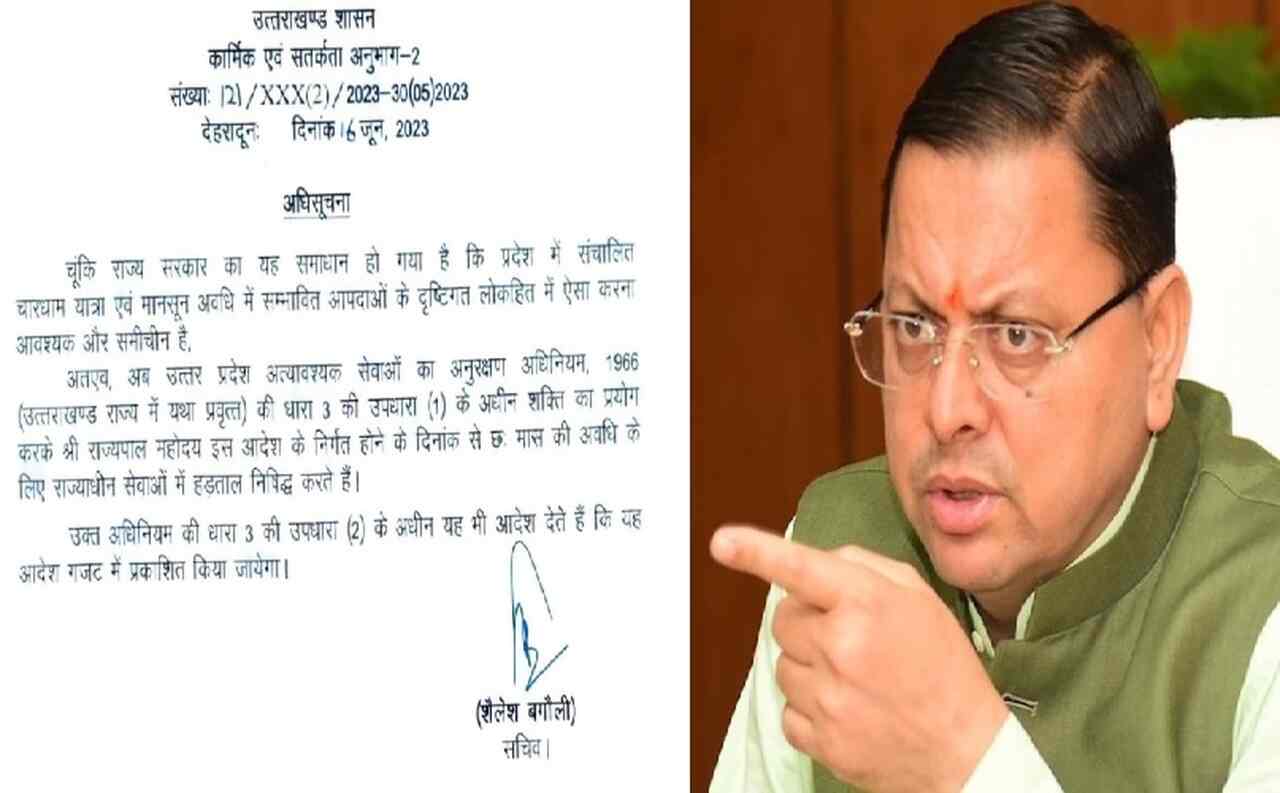 देहरादून: उत्तराखंड में पुष्कर सिंह धामी सरकार ने बड़ा फैसला लिया है. इसके तहत राज्य में अगले 6 महीने तक हड़ताल करने पर रोक रहेगी. उत्तराखंड शासन ने इस संबंध में अधिसूचना जारी कर दी है. सरकार का कहना है कि मानसूनी सीजन और चारधाम यात्रा के मद्देनजर यह फैसला लिया गया है. उत्तराखंड में पुष्कर सिंह धामी सरकार ने बड़ा फैसला लिया है. इसके तहत राज्य में अगले 6 महीने तक हड़ताल करने पर रोक रहेगी. सरकार का कहना है कि मानसूनी सीजन और चारधाम यात्रा के मद्देनजर यह फैसला लिया गया है. राज्य शासन ने इस संबंध में अधिसूचना जारी कर दी है.