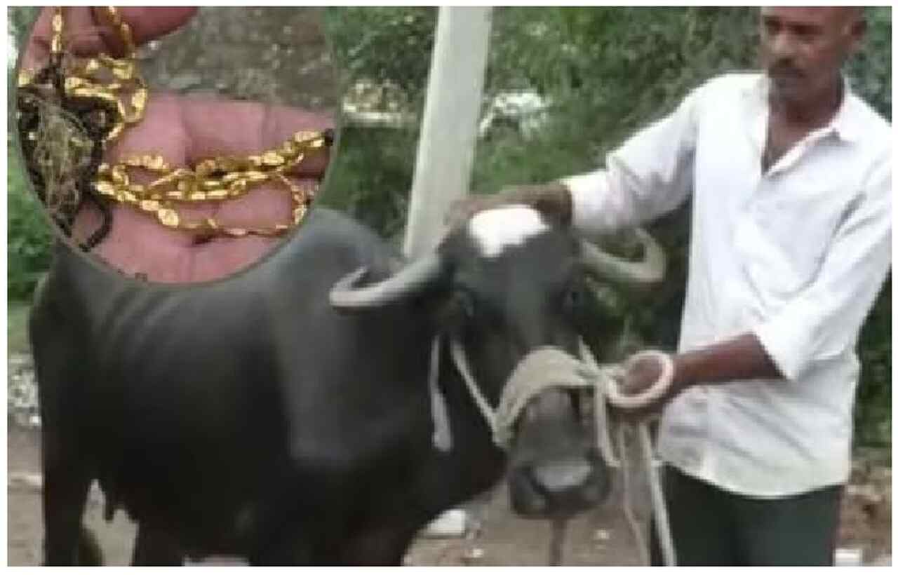 वाशिम: महाराष्ट्र के वाशिम जिले से एक अजीबोगरीब मामला सामने आया है. यहां पर एक भैंस ने सवा लाख रुपए कीमत का मंगलसूत्र निगल लिया. डॉक्टरों ने ऑपरेशन करके भैंस के पेट में चीरा लगाया, तब जाकर ढाई तोले का मंगलसूत्र बाहर निकाला. इस सर्जरी में भैंस को 65 टांके लगाने पड़े. जिले के सारसी गांव का यह मामला है. किसान रामहरि की पत्नी ने नहाने को जाते समय अपना मंगलसूत्र सोयाबीन और मूंगफली के छिलकों से भरी एक प्लेट छिपा दिया था. नहाकर निकलने के बाद उसने वही छिलकों वाली प्लेट बर्तन भैंस के सामने खाने को रख दी और घर के काम में लग गई.