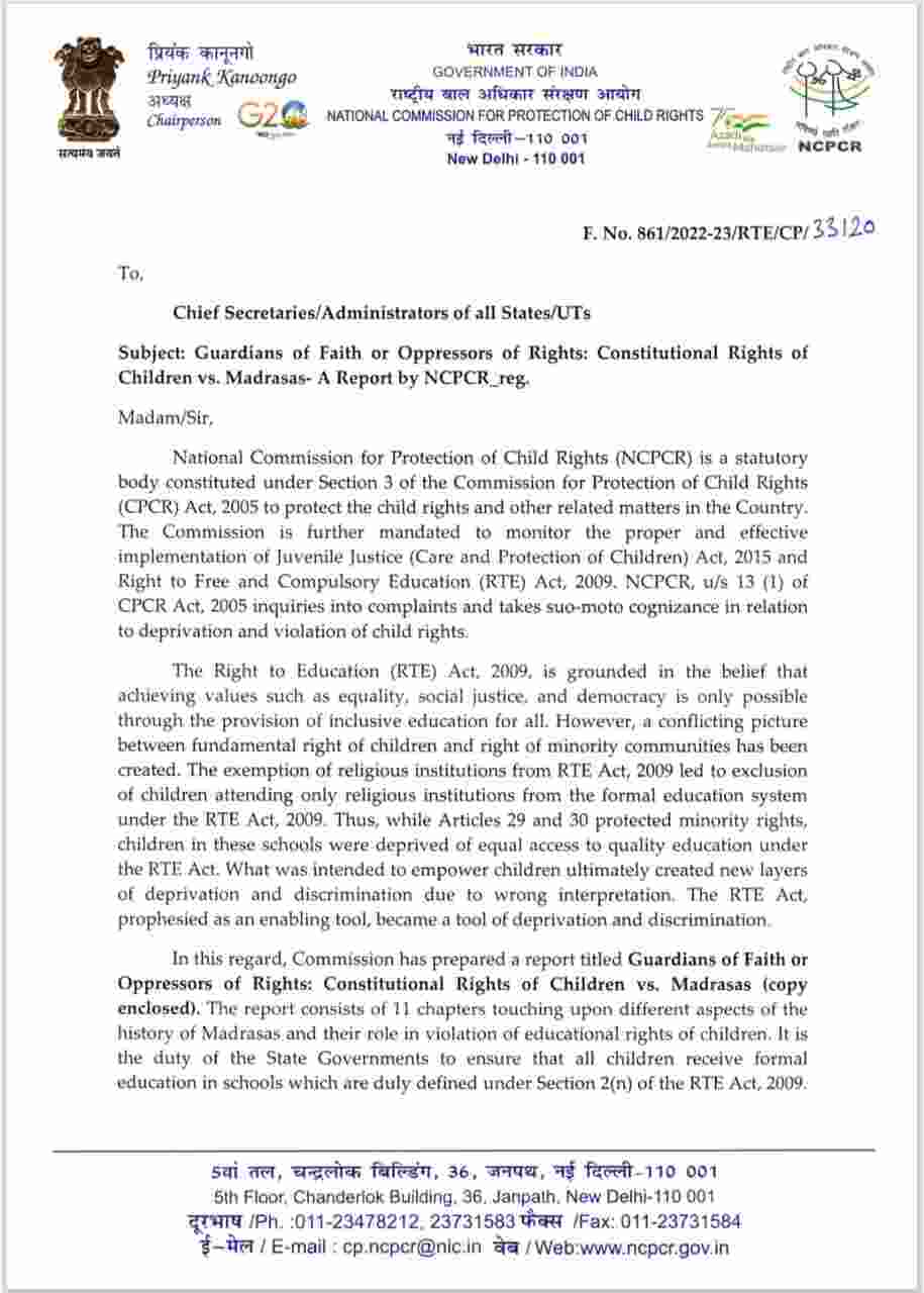 इसके साथ ही पत्र के जरिए ये भी सिफारिश की गई है कि “सभी गैर-मुस्लिम बच्चों को मदरसों से निकालकर आरटीई अधिनियम, 2009 के अनुसार बुनियादी शिक्षा प्राप्त करने के लिए स्कूलों में भर्ती कराया जाए. साथ ही, मुस्लिम समुदाय के बच्चे जो मदरसों में पढ़ रहे हैं, चाहे वे मान्यता प्राप्त हों या गैर-मान्यता प्राप्त हों, उन्हें औपचारिक स्कूलों में दाखिला दिलाया जाए. आरटीई अधिनियम, 2009 के अनुसार निर्धारित समय और पाठ्यक्रम की शिक्षा दी जाए”