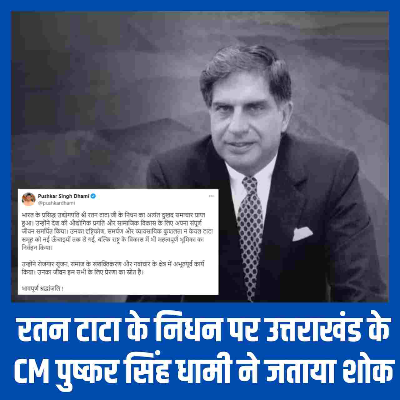 देहरादून: उद्योगपति रतन टाटा के निधन का पर सीएम धामी ने गहरा दुख जताया। सोशल मीडिया पर पोस्ट लिखते हुए उन्होंने कहा कि अत्यंत दुखद समाचार प्राप्त हुआ। रतन टाटा ने देश की औद्योगिक प्रगति और सामाजिक विकास के लिए अपना संपूर्ण जीवन समर्पित किया।