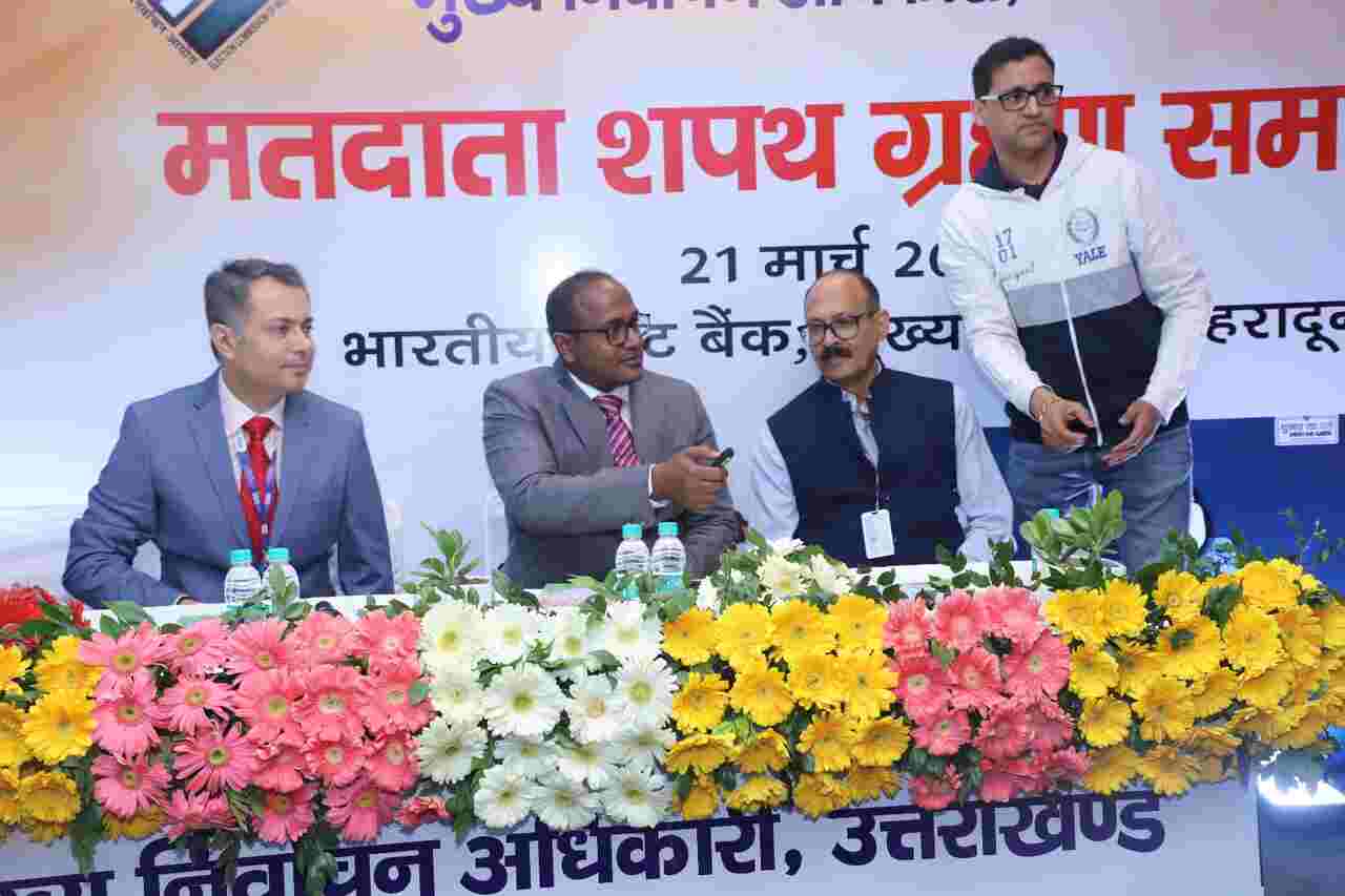 देहरादून: मुख्य निर्वाचन अधिकारी डॉ. बी.वी.आर.सी. पुरुषोत्तम ने गुरुवार को देहरादून स्थित भारतीय स्टेट बैंक के प्रधान कार्यालय में आयोजित मतदाता जागरूकता कार्यक्रम में प्रतिभाग किया। इस अवसर पर मुख्य निर्वाचन अधिकारी डॉ. पुरुषोत्तम ने “वोट करेगा उत्तराखण्ड” थीम का अनावरण किया। कार्यक्रम के दौरान मुख्य निर्वाचन अधिकारी ने वहां मौजूद समस्त बैंक कर्मियों को मतदाता शपथ दिलाई।