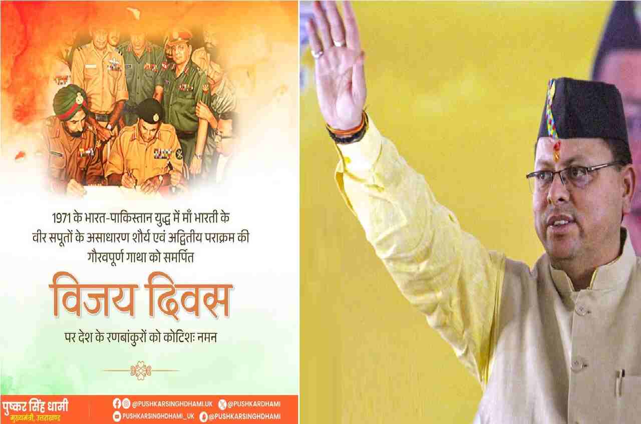 देहरादून। मुख्यमंत्री पुष्कर सिंह धामी ने विजय दिवस के अवसर पर भारतीय सेना, भूतपूर्व सैनिकों, एवं प्रदेशवासियों को बधाई दी है। उन्होने कहा कि भारत के सैन्य इतिहास में 16 दिसम्बर भारतीय सशस्त्र सेनाओं के साहस, समर्पण और बलिदान को याद करने का ऐतिहासिक दिन है। इस दिन भारतीय सैनिकों के साहस व बहादुरी के सामने नतमस्तक होकर पाकिस्तानी सेना के हजारों सैनिकों को आत्मसमर्पण करना पड़ा था। उन्होंने कहा कि देश की रक्षा के लिए हमारे वीर सैनिक हमेशा तत्परता के साथ अपना योगदान देते है जिस पर हमें गर्व है।