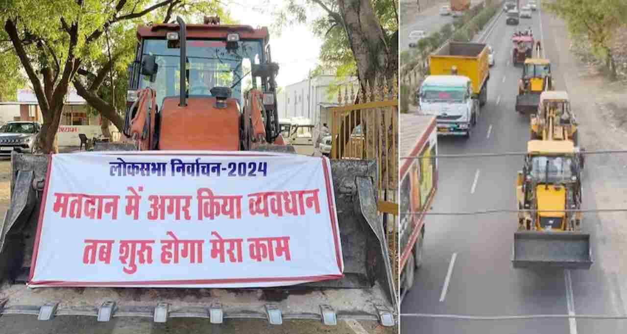 मुरैना: मध्य प्रदेश के चंबल इलाके में आने वाले मुरैना संसदीय क्षेत्र में 7 मई को लोकसभा मतदान होना है. जिला प्रशासन ने चुनाव शांतिपूर्वक करवाने के लिए बुलडोजर का सहारा लिया है. पुलिस ने बुलडोजर पर साफ लिखा है- ‘मतदान में अगर किया व्यवधान किया तब शुरू होगा मेरा काम.’