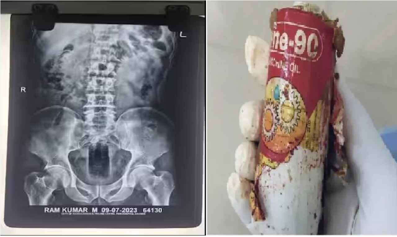 बीकानेर: हैरान करने वाली ये खबर राजस्थान के बीकानेर शहर से है। ये एक्सरे रिपोर्ट यूपी के रहने वाले राम कुमार का है जो बीकानेर में रहकर मजदूरी कर रहा है। लेकिन तीन दिन से अस्पताल में भर्ती है। उसके गुप्तांग से डॉक्टरों की टीम ने सात इंच लंबा और तीन इंच चौड़ा प्लास्टिक का एक केन निकाला है। फिलहाल उसकी सर्जरी की गई है और उसकी हालत स्थिर बनी हुई है। मामला हैरान करने वाला है। जेएनवीसी थाना पुलिस इस मामले की जांच कर रही है।