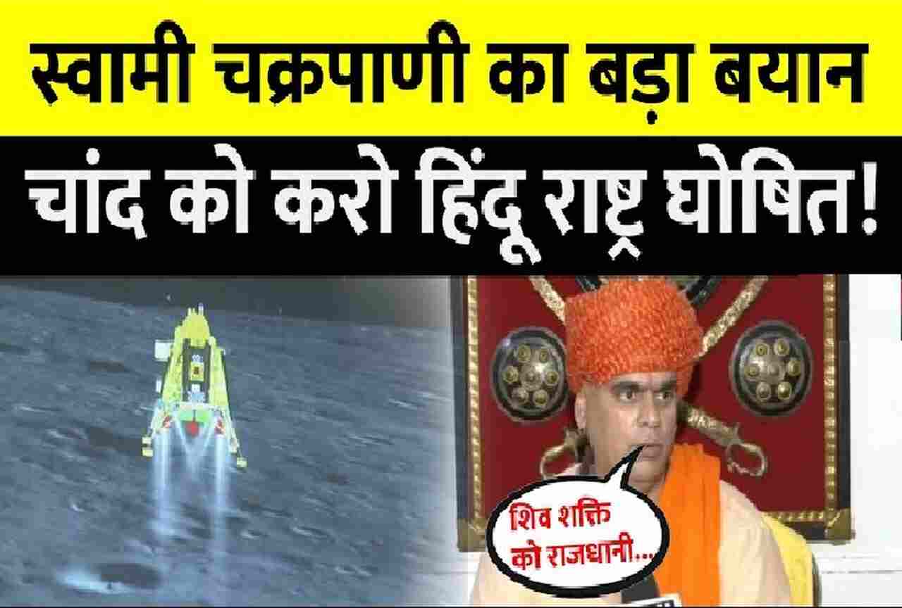 स्वामी चक्रपाणि ने कहा है कि चांद को हिंदू राष्ट्र घोषित किया जाना चाहिए। इसे संसद को हिंदू राष्ट्र के रूप में मान्यता देनी चाहिए। इसके साथ ही चंद्रयान-3 की लैंडिंग वाली जगह शिव शक्ति पुनीत को वहां की राजधानी बनाना चाहिए। उन्होंने कहा कि ऐसा करने से वहां को आतंकी जिहादी मानिसकता से नहीं पहुंच पायेगा।इसके साथ ही उन्होंने चंद्रयान-3 की लैंडिंग वाली जगह का नाम शिव शक्ति रखने पर पीएम मोदी का आभार जताया है।