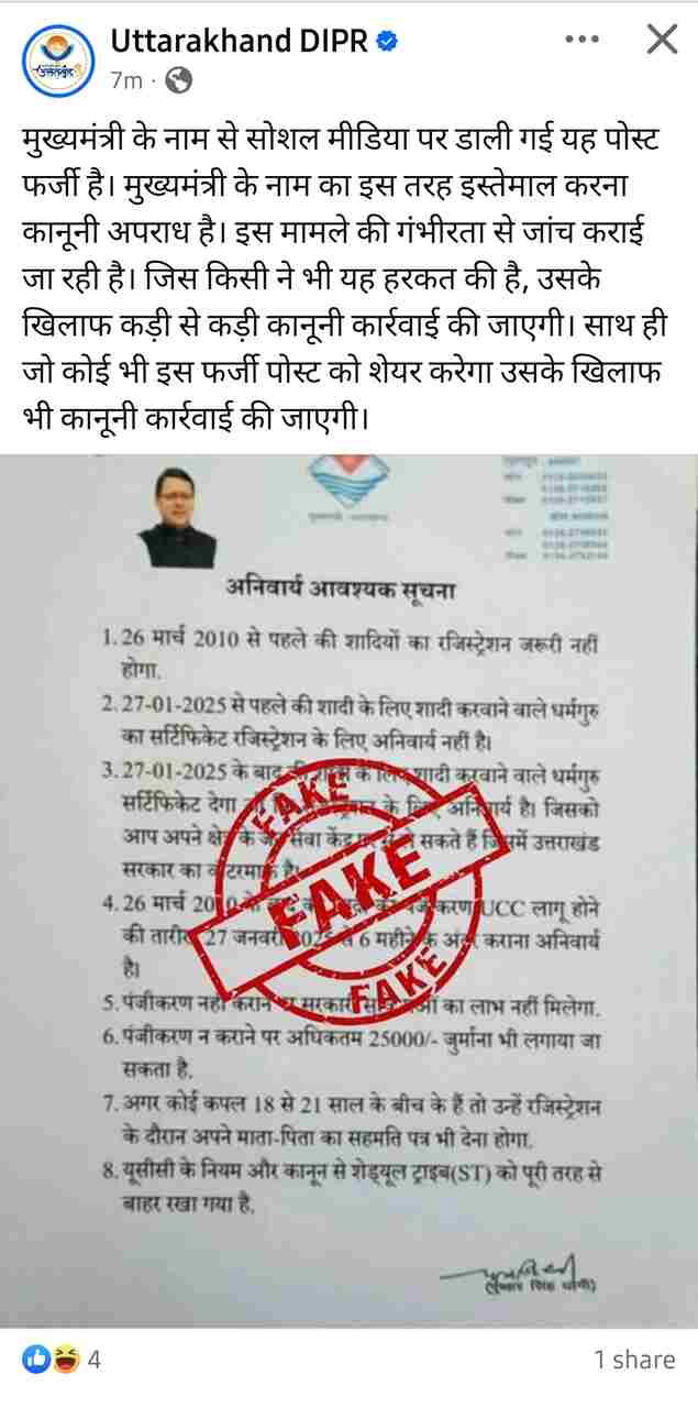 देहरादून: उत्तराखंड में यूनिफॉर्म सिविल कोड लागू होने के बाद लोगों में अभी भी तमाम भ्रांतियां मौजूद हैं. इसी बीच सोशल मीडिया पर UCC से जुड़ी कुछ जानकारियां प्रचारित की जा रही हैं. ये जानकारियां मुख्यमंत्री पुष्कर सिंह धामी के लेटर पैड और उनकी फोटो के साथ सोशल मीडिया पर वायरल हो रही हैं. जिसमें ये कहा गया है कि यूनिफॉर्म सिविल कोड लागू होने की तिथि से यानी 27 जनवरी 2025 के बाद की शादी के लिए धर्मगुरुओं से सर्टिफिकेट लेना होगा जिसको विवाह रजिस्ट्रेशन के लिए अनिवार्य किया गया है.