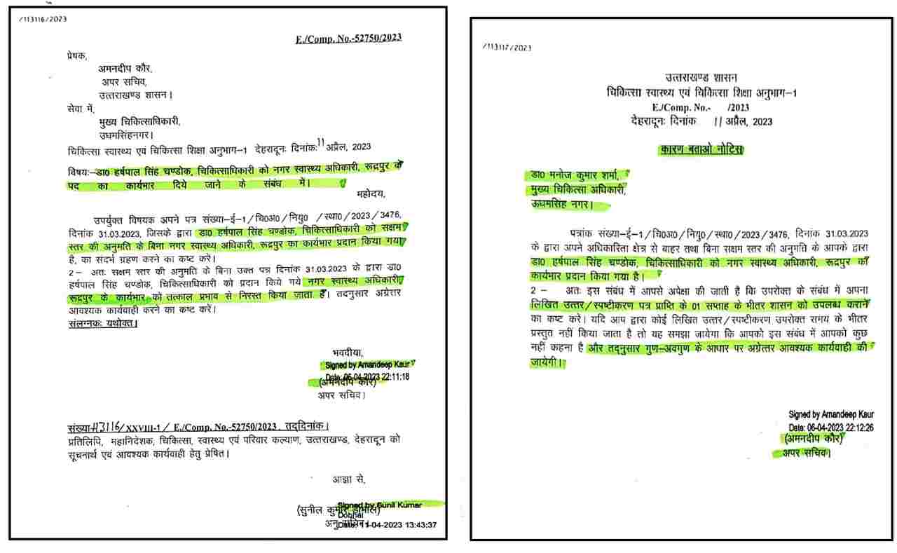 DG (Health) ने भी बिना शासन को बताए खुद ही तबादला कर दिया था.उनसे स्पष्टीकरण माँगा गया है.ये मामला अभी चल ही रहा था कि CMO ने खुद ही रुद्रपुर के नगर स्वास्थ्य अधिकारी की पोस्टिंग कर दी.उन्होंने डॉ हर्षपाल को चंडोक को इस कुर्सी पर बिठा दिया.इसकी जानकारी मिलने पर शासन ने पोस्टिंग रद्द कर दी.
