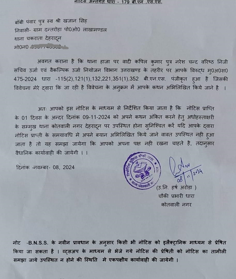 दरअसल, धारा चौकी के उप निरीक्षक हर्ष अरोड़ा ने बॉबी पवार के नाम नोटिस जारी करते हुए उन्हें थाने में आने के लिए कहा है, ताकि उनके बयान लिए जा सके. नोटिस में 9 नवंबर 2024 को थाना कोतवाली नगर में उपस्थित होने के लिए कहा गया है. इस दौरान ये भी स्पष्ट किया गया है कि यदि बॉबी पंवार अपना पक्ष रखने के लिए थाने में नहीं पहुंचते हैं तो मामले में उनके पक्ष नहीं रखने की इच्छा मानते हुए वैधानिक कार्रवाई की जाएगी.
