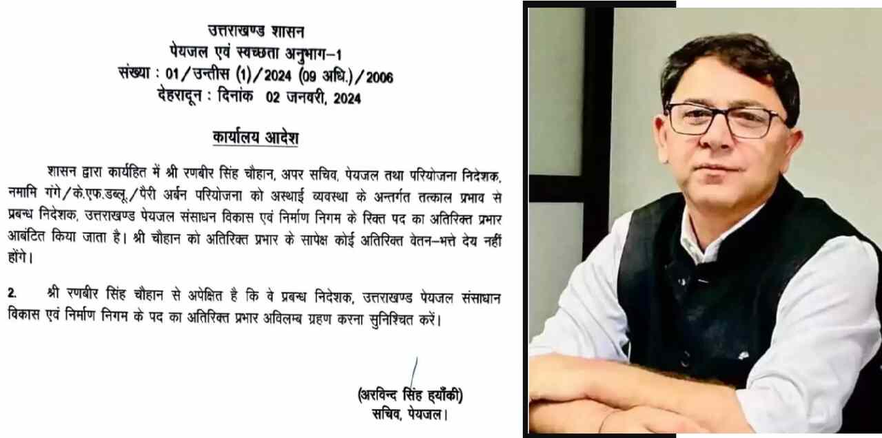 देहरादून – शासन द्वारा कार्यहित में रणबीर सिंह चौहान, अपर सचिव, पेयजल तथा परियोजना निदेशक, नमामि गंगे /के.एफ.डब्लू. / पैरी अर्बन परियोजना को अस्थाई व्यवस्था के अन्तर्गत तत्काल प्रभाव से प्रबन्ध निदेशक, उत्तराखण्ड पेयजल संसाधन विकास एवं निर्माण निगम के रिक्त पद का अतिरिक्त प्रभार आबंटित किया जाता है। श्री चौहान को अतिरिक्त प्रभार के सापेक्ष कोई अतिरिक्त वेतन-भत्ते देय नहीं होंगे।