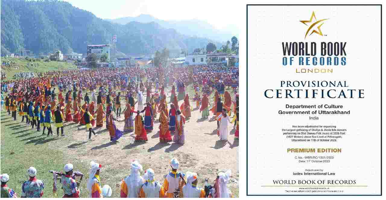 देहरादून: प्रधानमंत्री नरेन्द्र मोदी के 12 अक्टूबर को देवभूमि उत्तराखण्ड आगमन पर उत्तराखण्ड के छोलिया और झौडा लोक नृतकों की ढोल दमाऊँ लोक वाद्यों के साथ प्रस्तुति को वर्ल्ड बुक ऑफ रिकार्ड में स्थान प्राप्त हुआ है। यह जानकारी देते हुये निदेशक संस्कृति विभाग द्वारा बताया गया है कि सीमान्त जनपद पिथौरागढ़ में समुद्र तल से 5338 फीट (1627) मीटर की आश्चर्यजनक ऊँचाई पर एक अनोखा और ऐतिहासिक कार्यक्रम संस्कृति विभाग, उत्तराखण्ड द्वारा आयोजित किया गया। उत्तराखण्ड के इतिहास में पहला कार्यक्रम था जिसमें जनपद पिथौरागढ़ के सुदूरवर्ती अंचलों से छोलिया एवं झौड़ा नृत्यक दल के लगभग 3000 लोक कलाकारों द्वारा अपनी पारम्परिक वेश-भूषा एवं लोक गीतों के माध्यम से विश्व का ध्यान उत्तराखण्ड की ऐतिहासिक एवं समृद्धशाली लोक सांस्कृतिक विरासत की ओर आकर्षित किया हिमालय के हृदय सीमान्त जनपद पिथौरागढ़ में एक असाधारण एवं अभूतपूर्व घटना दुनिया को देखने को मिली।